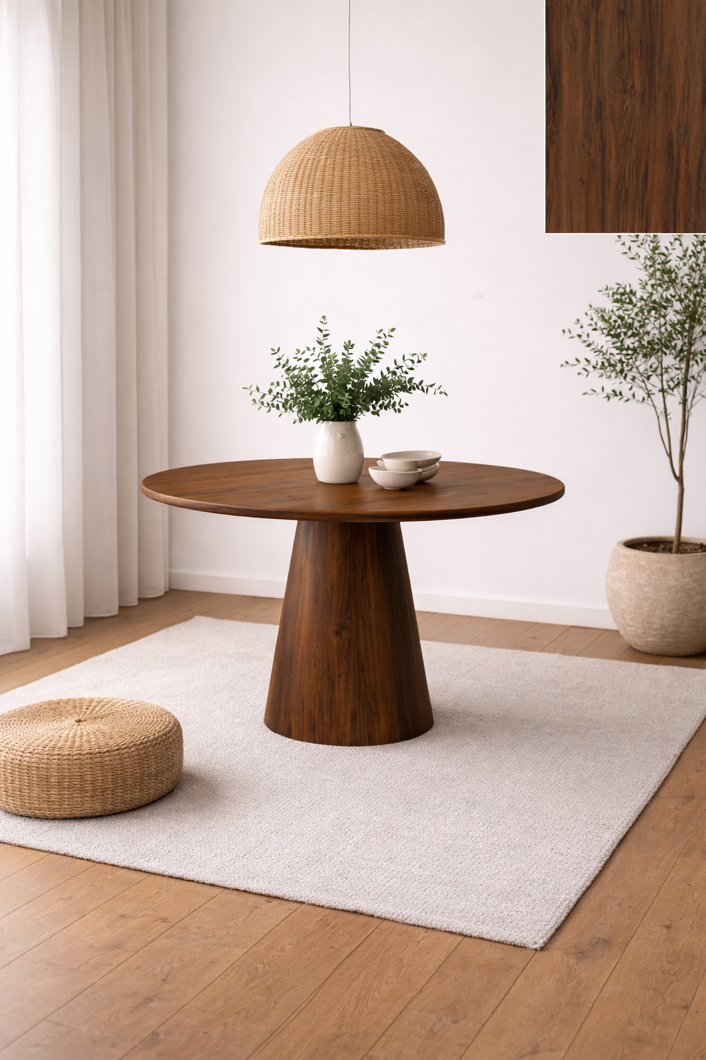 Seu tampo em MDF de 25mm com lâmina natural proporciona resistência e um acabamento refinado, destacando a beleza dos veios da madeira. A base, também em MDF com lâmina natural, garante estabilidade e durabilidade, além de complementar o design sofisticado da peça.