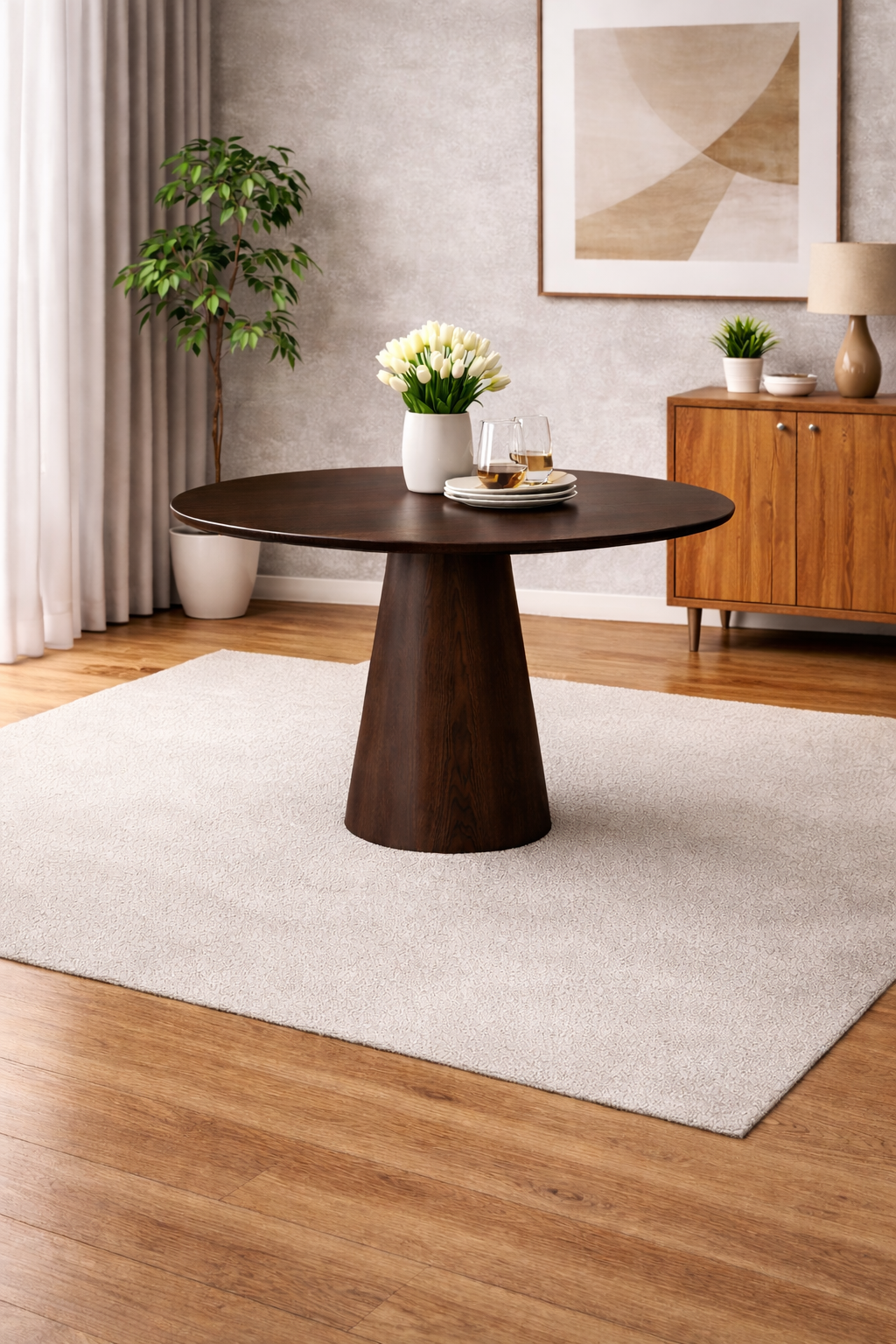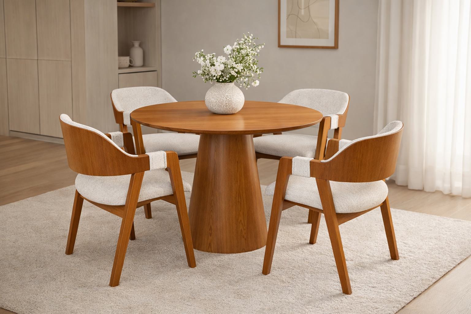 A Mesa Redonda Lunna é a escolha ideal para quem busca unir design contemporâneo, funcionalidade e acabamento de alto padrão. Com linhas suaves e um visual elegante, ela se adapta perfeitamente a salas de jantar, cozinhas ou espaços gourmet, valorizando a decoração com um toque moderno e acolhedor.